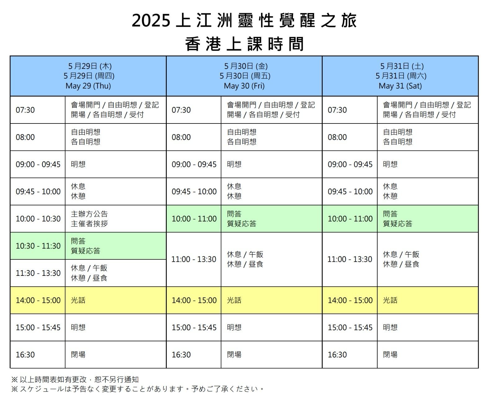 3日間のセミナーは、各日とも光話、明想、質疑応答、ヒーリングを行います(時間割はこちら)。